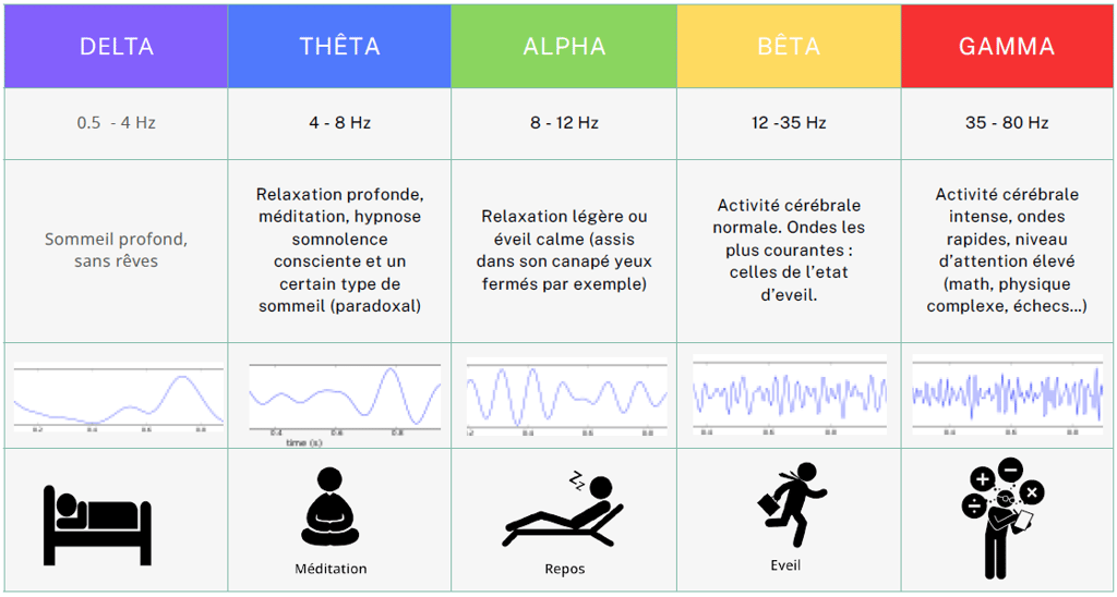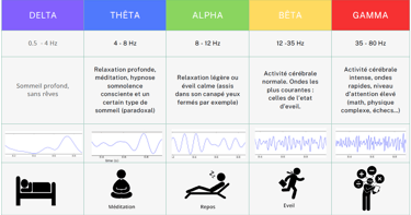 Au cours de la journée, notre activité cérébrale naturelle varie entre différentes fréquences d'ondes, chacune associée à des états de conscience différents. Voici un aperçu général de ces fréquences :